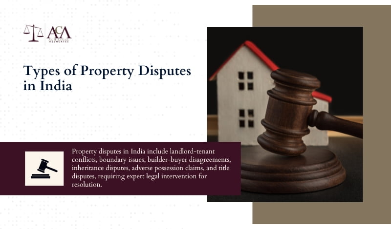 The common types of property disputes in India include property boundary disputes, builder-buyer disputes, disputes over inherited or willed properties, disputes between co-owners, adverse possession disputes, landlord-tenant disputes, builder-developer disputes and title disputes. These disputes often arise from unclear property rights, fraudulent documentation or breach of contractual terms.